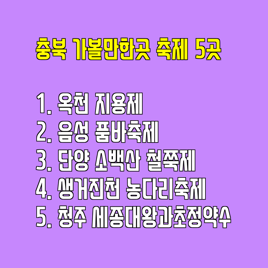 ¿À´ÃÀº ÃæºÏ¿¡¼ °³ÃֵǴ ´Ù¾çÇÑ ÃàÁ¦ 5°÷À» ¼Ò°³ÇÕ´Ï´Ù. ÃæÃ»ºÏµµ´Â ¼¿ï¿¡¼ ¸ÕµíÇÏÁö¸¸ ´çÀÏÄ¡±â ¿©ÇàÀ¸·Î ´Ù³à¿Ã ¼ö ÀÖ°í, ¾Æ·§³è¿¡¼µµ ÃæºÐÈ÷ ÇÏ·ç ¸¸¿¡ ´Ù³à°¥ ¼ö ÀÖ´Â ±³ÅëÀÌ ÁÁÀº °÷ÀÔ´Ï´Ù.