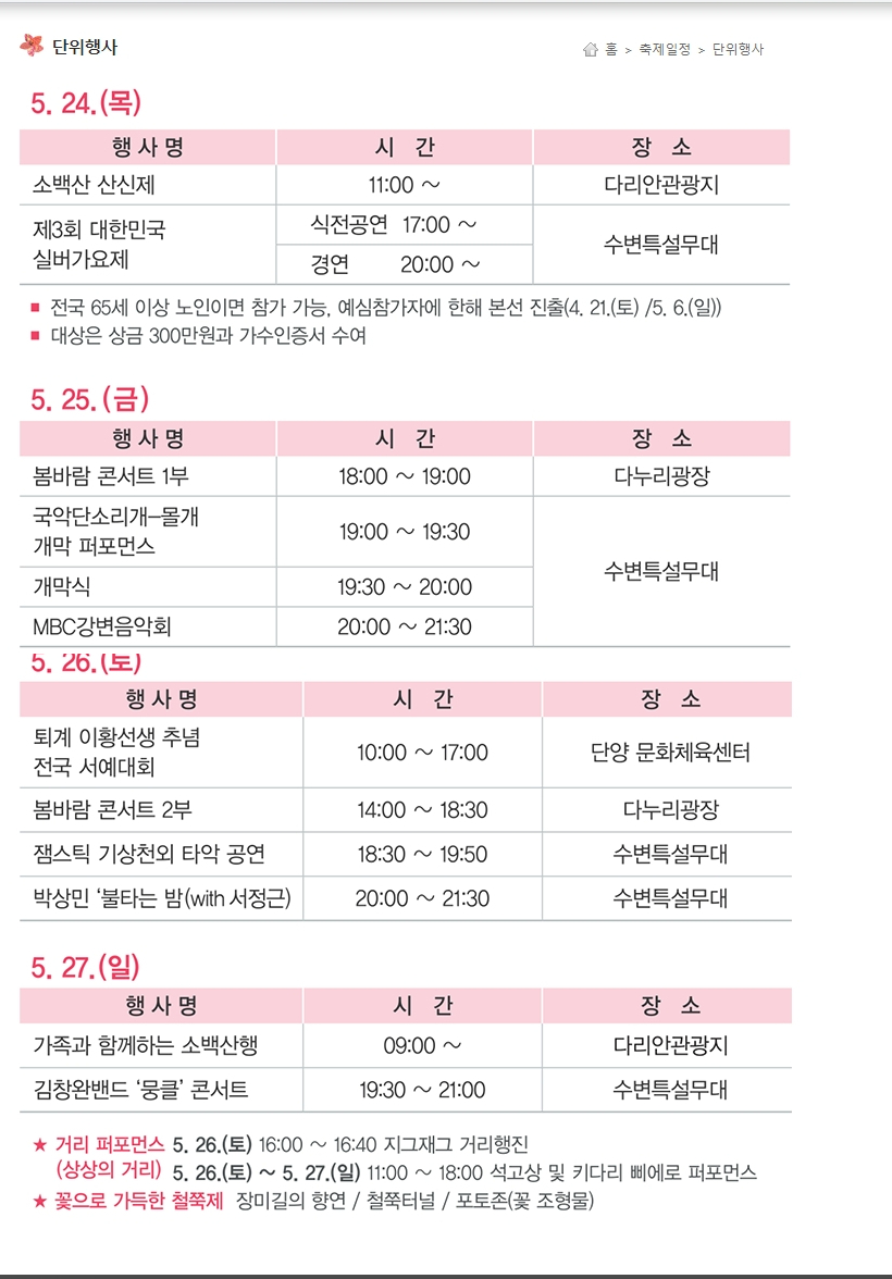ÃæºÏ ÃàÁ¦·Î ÀÌ¹Ì ¾Ë·ÁÁø ´Ü¾ç ¼Ò¹é»ê ÃàÁ¦¸¦ ºñ·ÔÇØ¼ À½¼º ǰ¹ÙÃàÁ¦ ±×¸®°í ¿ÁõÀÇ Áö¿ëÁ¦, »ý°ÅÁøÃµ ³ó´Ù¸® ÃàÁ¦. ûÁÖ ¼¼Á¾´ë¿Õ°ú ÃÊÁ¤¾à¼ö ÃàÁ¦°¡ ¾Æ¸§´Ù¿î °èÀý 5¿ù¿¡ ÆîÃÄÁö´Â µ¥¿ä. °¢°¢ ÃàÁ¦¸¶´Ù Ư¡ÀÌ ÀÖ°í Çà»çµµ ´Ùä·Î¿ö ½Ã°£ ³ª´Â ´ë·Î ÃæºÏ ¿©Çà ÄÚ½º¸¦ Àâ¾Æ ÃàÁ¦¸¦ Áñ°Üº¸¼¼¿ä.