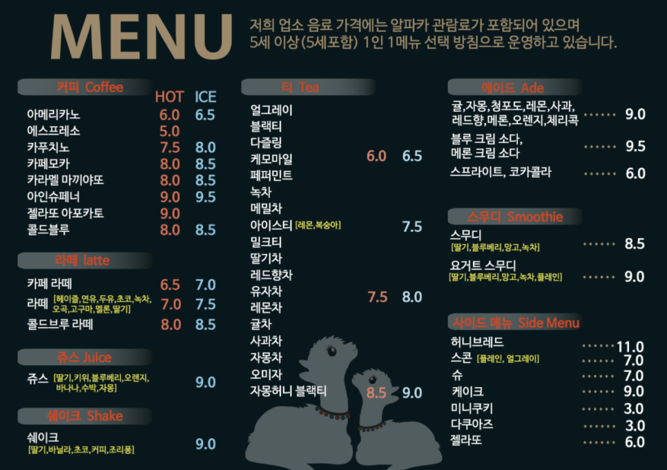 Æòâ Ä«Æä ¸¶ÃßÇÈÃß À½·á °¡°Ý¿¡ ¾ËÆÄÄ« °ü¶÷·á°¡ Æ÷ÇԵǾî ÀÖ½À´Ï´Ù. 5¼¼ ÀÌ»óÀº 1ÀÎ 1¸Þ´º·Î ¿î¿µÇϰí ÀÖ½À´Ï´Ù.