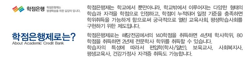 ÇÐÁ¡ÀºÇàÁ¦ ¶ó°í Ȥ½Ã µé¾îº¸¼Ì´ÂÁö ¸ð¸£°Ú´Âµ¥¿ä~ ½±°Ô ¸»¾¸µå¸®¸é °íµîÇб³ Á¹¾÷ÀÚ°¡ Á¤±Ô ´ëÇб³¿¡ ´Ù´ÏÁö ¾Ê°í Àü¹®ÇÐ»ç ¶Ç´Â ÇлçÇÐÀ§¸¦ ÃëµæÇÒ ¼ö ÀÖ´Â Á¦µµ ÀÔ´Ï´Ù. ÇÐÁ¡ÀºÇàÁ¦·Î´Â ÇØ´çÀü°ø¿¡¼ 140ÇÐÁ¡À» ÃëµæÇϸé 4³âÁ¦ ÇлçÇÐÀ§¸¦, 80ÇÐÁ¡À» À̼öÇϸé 2³âÁ¦ Àü¹®Çлç ÇÐÀ§¸¦ ÃëµæÇÒ ¼ö ÀÖ´Ù°í ÇÕ´Ï´Ù. ÇнÀÀÚÀÇ Æ¯¼º¿¡ µû¶ó ÆíÀÔÇÐ, º¸À°±³»ç, »çȸº¹Áö»ç, Æò»ý±³À°»ç, °Ç°°¡Á¤»ç ÀÚ°ÝÁõ Ãëµæµµ °¡´ÉÇÏ´Ù°í ÇÕ´Ï´Ù. ÇöÀç ÇÐÁ¡ÀºÇàÁ¦¿¡¼ ³× °¡Áö ǪÁüÇÑ À̺¥Æ®µéÀ» ÁøÇàÇϰí ÀÖ´Ù°í ÇÕ´Ï´Ù. ÇÐÁ¡ÀºÇàÁ¦·Î º¸À°±³»ç2±Þ ÀÚ°ÝÁõÀ» Àú·ÅÇÑ ºñ¿ëÀ¸·Î ȹµæÇϰíÀÚ ÇϽô ºÐµé²² ÁÁÀº ±âȸÀÎ °Í °°½À´Ï´Ù. ÇÐÁ¡ÀºÇàÁ¦ À̺¥Æ®¿¡ ´ëÇÏ¿© ±Ã±ÝÇϽŠ»çÇ×ÀÌ Àְųª ½ÅûÇÏ°í ½ÍÀ¸½Å ºÐÀº ¾Æ·¡ ¹è³Ê¸¦ ÅëÇØ ¹«·á»ó´ã½ÅûÀ» ¹Þ¾Æº¸½Ç ¼ö ÀÖ½À´Ï´Ù.