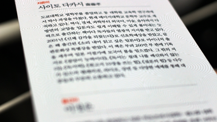 ¾öû³ ´ë¹ÚÀº ¾øÁö¸¸ Àº±ÙÈ÷ ¸¹Àº »ç¶÷µé¿¡°Ô ¼±ÅùÞÀº Ã¥À» ´Ù¼ö ÃâÆÇÇÑ »çÀÌÅä ´ÙÄ«½ÃÃ¥ÀÌ´Ù. ºÎÁ¤È®ÇÑ µ¥ÀÌÅÍÁö¸¸ ¾Æ¸¶µµ Çѱ¹¿¡ ¹ø¿ªµÈ ÀϺ» ÀúÀÚÁß¿¡ »óÀ§±Ç¿¡ µé¾î°¡Áö ¾ÊÀ»±î ½ÍÀ» Á¤µµ·Î »ó´çÈ÷ ¸¹Àº Ã¥ÀÌ ¹ø¿ªµÇ¾ú´Ù. ±×¸¸Å ÀϺ»¿¡¼µµ ¸¹Àº Ã¥ÀÌ ÃâÆÇµÇ¾ú´Ù´Â ¶æÀÏÅ×°í. »çÀÌÅä ´ÙÄ«½ÃÀÇ Ã¥Àº ÃÖ±Ù¿¡ °øºÎ³ª µ¶¼¿Í °ü·ÃµÇ¾î ±× Á߿伺À» ¾Ë·ÁÁִ åÀÌ ´Ù¼ö¿´´Âµ¥ Àдٺ¸¸é "´Ïü"¿¡ ´ëÇØ ²Ï ¸¹ÀÌ ¾ð±ÞÇÏ´Â °É ´À²¼´Ù. ½ÇÁ¦·Î ´Ïü¿¡ ´ëÇØ Ã¥À» ½è´Ù°íµµ Çß°í.