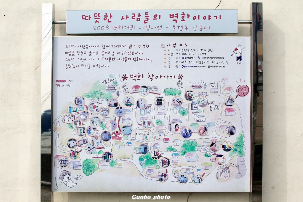 ºÎ»ê¿¡ ÀÖ´Â º®È¸¶À» Áß¿¡ ÇϳªÀÎ ¹®Çöµ¿ ¾Èµ¿³× º®È¸¶À»À» ¼Ò°³ÇϰڽÀ´Ï´Ù. ÀÌ ¸¶À»Àº ºÎ»ê ÃÖÃÊÀÇ ±×¸²º®È¸¶À»À̶ó ºÒ¸®´Â °÷ÀÔ´Ï´Ù. 2008³â º®È°Å¸® ½Ã¹ü»ç¾÷À¸·Î Áֹΰú ÀÚ¿øºÀ»çÀÚ°¡ ÇÔ²² Âü¿©ÇÏ¿© ¸¸µé¾îÁ³´Ù°í ÇÕ´Ï´Ù. ¾ó¸¶ Àü Ȳ·É»êÀ¸·Î °¡´Â ±æ¿¡ Àá½Ã µé·È¾ú´Âµ¥, Àç°³¹ß·Î ÀÎÇØ °ÅÀÇ ÃâÀÔÀÌ ÅëÁ¦µÇ°í ÀÖ¾ú½À´Ï´Ù. ÀÌÁ¦ ´õ ÀÌ»óÀº ¸¶À»À» ãÀ» ¼ö ¾øÀ» °Í °°¾Ò½À´Ï´Ù. ¹®Çöµ¿ ¾Èµ¿³× º®È¸¶À»Àº ºÀÁØÈ£ °¨µ¶ÀÇ ¿µÈ '¸¶´õ'ÀÇ ÃÔ¿µÁö·Îµµ À¯¸íÇßÀ¸¸ç, ¿¹´É '½ºÆÝÁö'¿¡¼ ¸¶À»ÀÇ °ñ¸ñ°ñ¸ñ¿¡ ¹¦Áö°¡ ÀÖ´Â °÷À¸·Îµµ ¼Ò°³µÈ ÀûÀÌ ÀÖ¾ú½À´Ï´Ù.