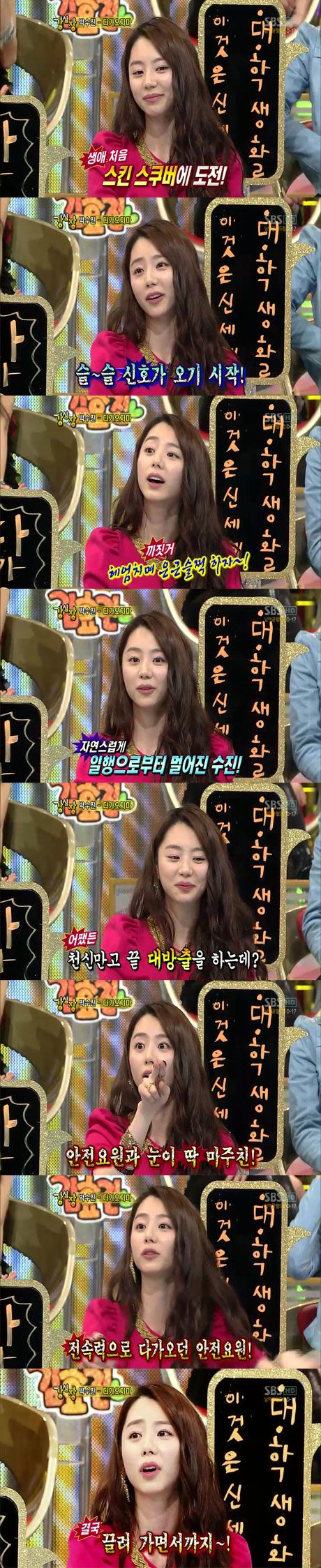 Áö³ 25ÀÏ ¹æ¼ÛµÈ SBS ¡®°½ÉÀ塯¿¡ Ã⿬ÇÑ ¹Ú¼öÁøÀº ¡®´Ù°¡¿ÀÁö¸¶¡¯¶ó´Â Åäũdz¼±À» °ø°³ÇØ ±Ã±ÝÁõÀ» ÀھƳ´Ù. ¹Ú¼öÁøÀº ¡°Çʸ®ÇÉ¿¡ ³î·¯°¡ ½ºÅ²½ºÄí¹ö¸¦ Çϱâ·Î Çß´Ù¡±¸ç, ¡°Ã³À½À̶ó ³Ê¹« ½Å³ª¼ µµÂøÇÏÀÚ¸¶ÀÚ Àá¼öº¹À» ÀÔ°í »ê¼ÒÅëÀ» ¸å´Ù. °¡±â Àü¿¡ ÈÀå½Ç¿¡ µé¸¦±î »ý°¢ÇßÁö¸¸ Àá¼öº¹À» ¹þ±â ±ÍÂú¾Æ ±×³É ¹Ù´Ù·Î µé¾î°¡±â·Î Çß´Ù¡±°í ¼³¸íÇß´Ù.