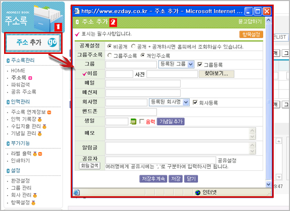 1) ÁÖ¼Ò·Ï ¸Þ´º ¿ÞÂÊ¿¡ ÀÖ´Â ÁÖ¼Ò Ãß°¡ ¹öưÀ» Ŭ¸¯ ÇÏ¸é ÆË¾÷âÀÌ ¶å´Ï´Ù.